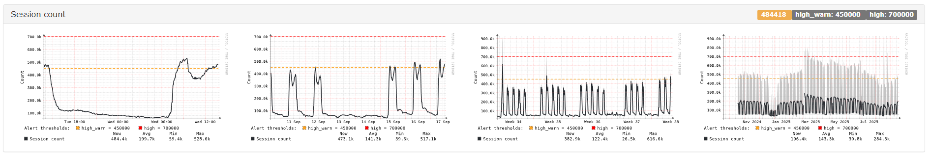 This means that the lines representing these thresholds can be seen in the graph, with the number appearing in orange if it exceeds the warning threshold and in red if it exceeds the critical threshold: