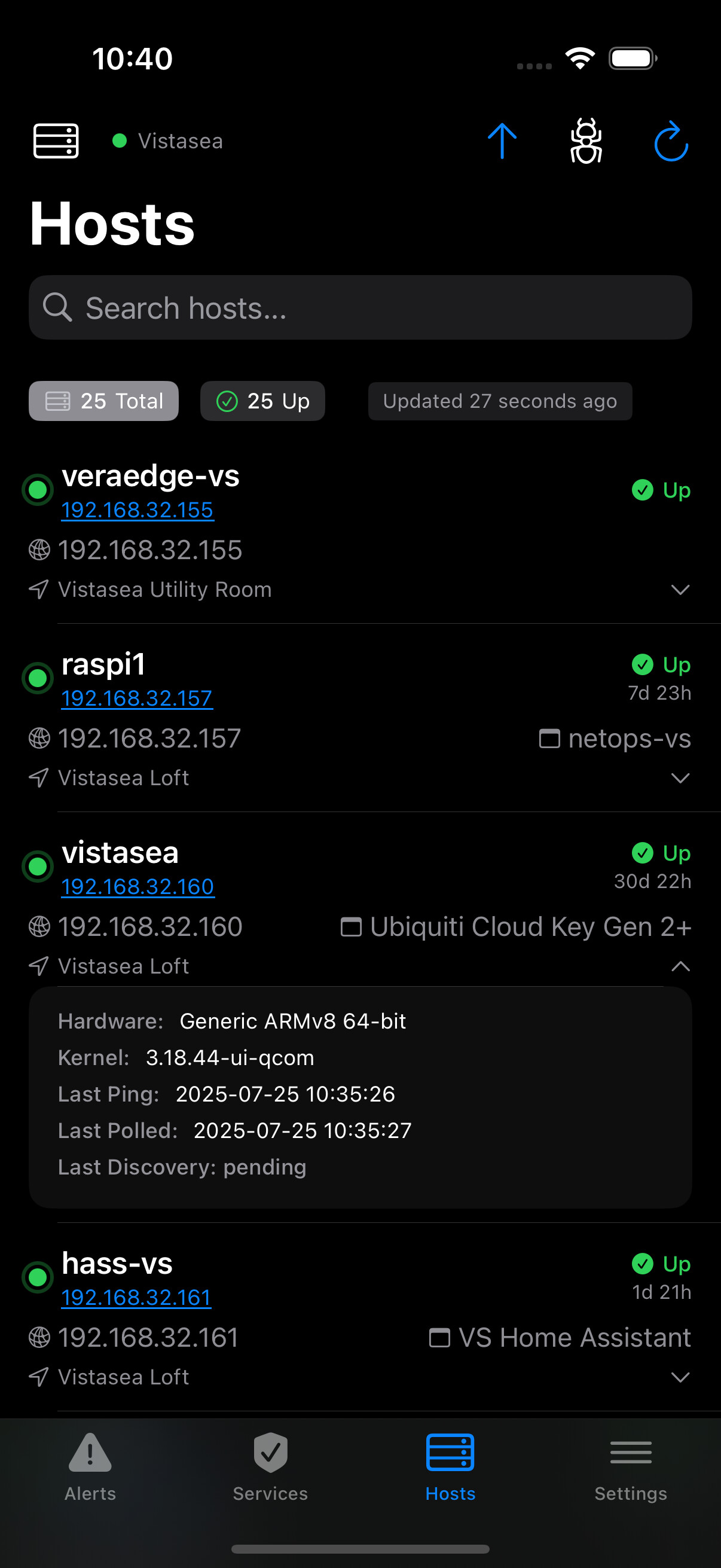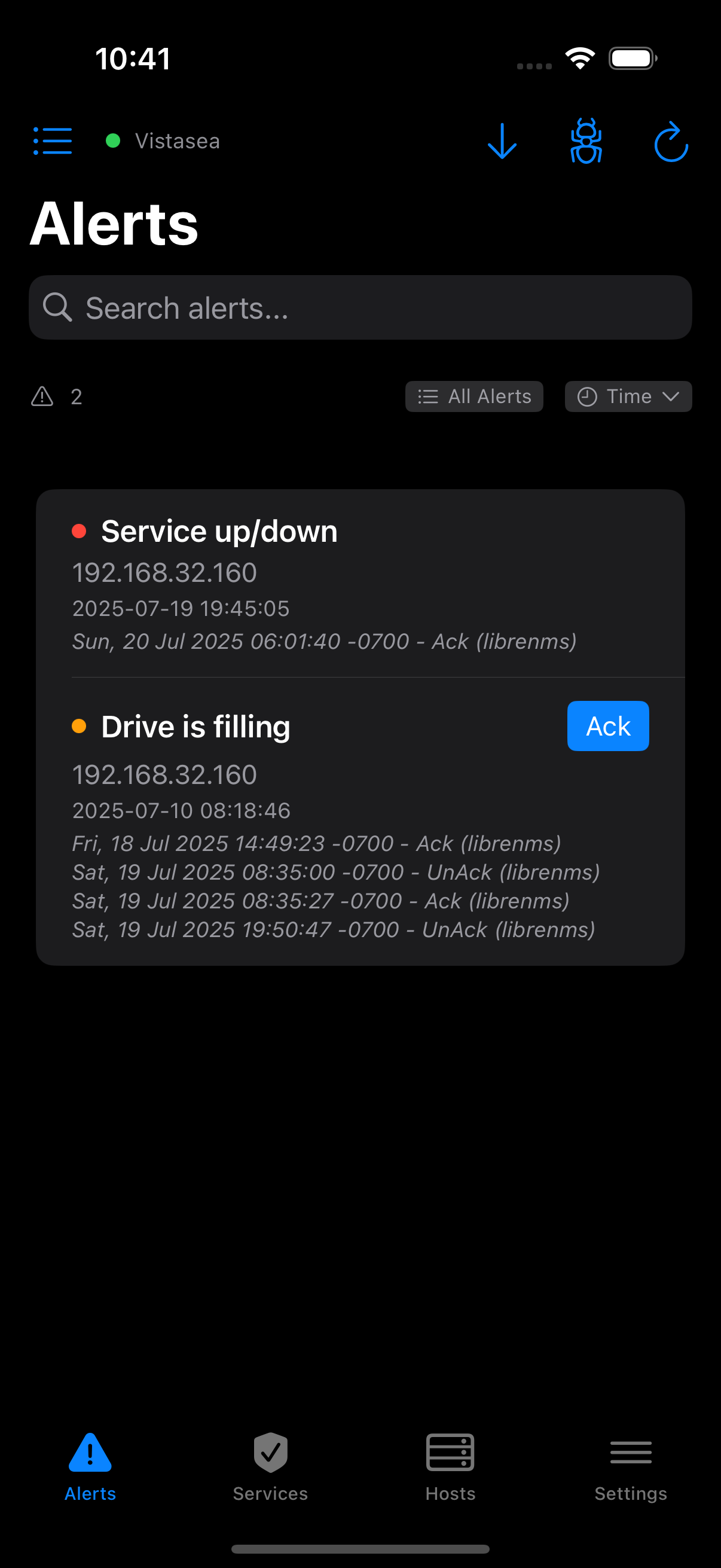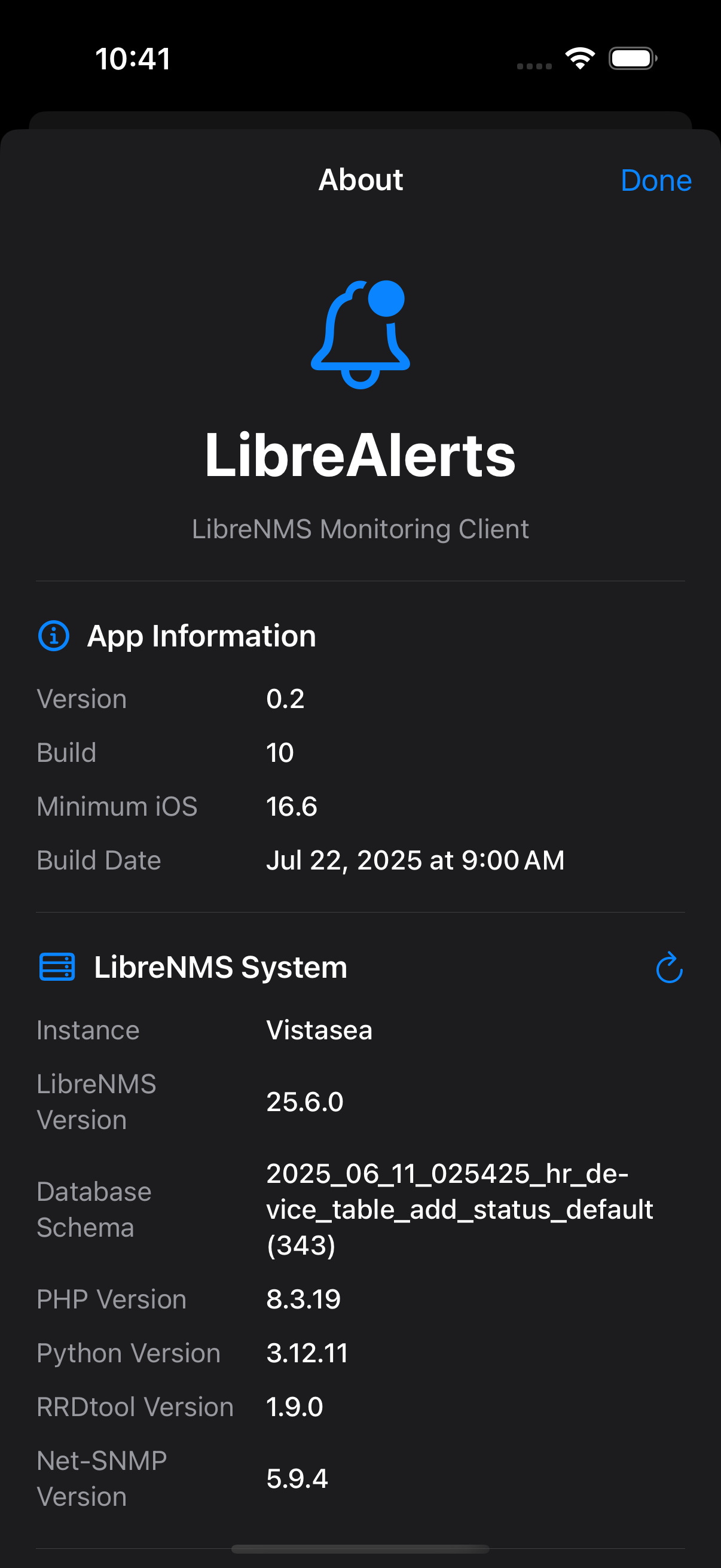 I’ve been working on a simple iOS app for monitoring and interacting with LibreNMS via the API. It’s in the very early stages - right now it monitors Alerts, Services and Hosts/Devices. You can acknowledge an alert, trigger the (re)discovery of a device, and tap to get to the web overview of a device via the browser. Also it works with multiple LibreNMS installations, though one at a time (I have two sites that I monitor).