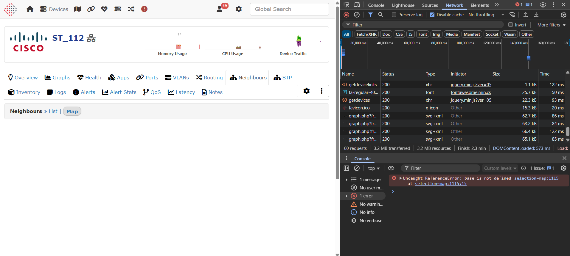 Thank you for your answer. When I configure the map to only xdp, I no longer receive the “LLDP/CDP not supported” error in log file. However, the map is blank again, and when I look at the browser console, I see the javascript error I’ve posted a picture of.