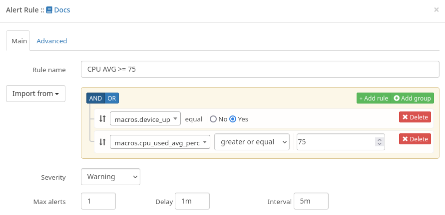 Now reload the Alerts page, and you can add a new alert using “macros.cpu_used_avg_perc” from the GUI: