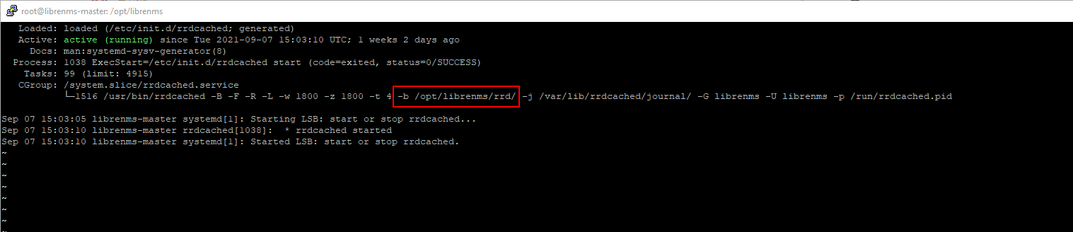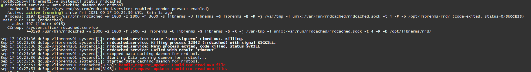 Process: 3197 ExecStart=/usr/bin/rrdcached -w 1800 -z 1800 -f 3600 -s librenms -U librenms -G librenms -B -R -j /var/tmp -l unix:/var/run/rrdcached/rrdcached.sock -t 4 -F -b /opt/librenms/rrd/ (code=exited, status=0/SUCCESS)