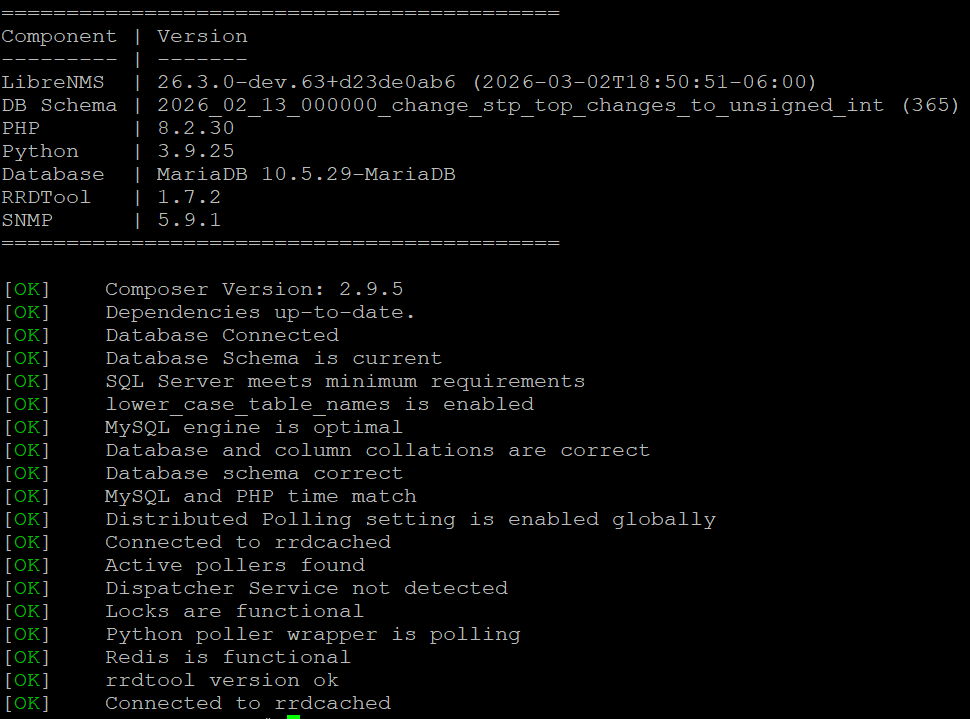 I’ve been running LibreNMS on RHEL 9.6 on a test server, and it was working smoothly until the server was updated to RHEL 9.7. Fortunately, it continues to function properly and is polling all the devices I have. Currently, it is polling data from four Windows devices as well as the LibreNMS test server itself.