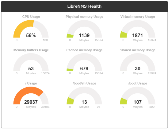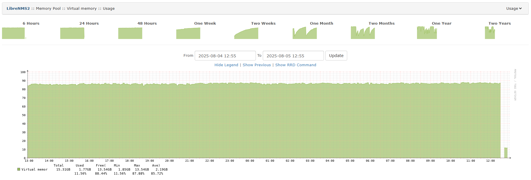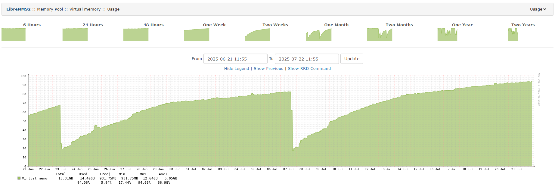 I’ve noticed that LibreNMS’ virtual memory usage is constantly increasing, until it reaches near-100% usage. Here’s a screenshot showing virtual memory usage for the last month. The drops are after a LibreNMS reboot.
